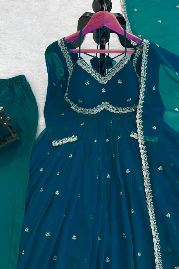 Teal Blue Embroidered Georgette Anarkali Gown with Dupatta & Flared Sleeves