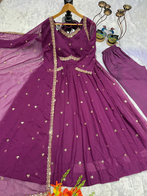 Wine Embroidered Anarkali Gown with Flared Design – Festive & Party Wear