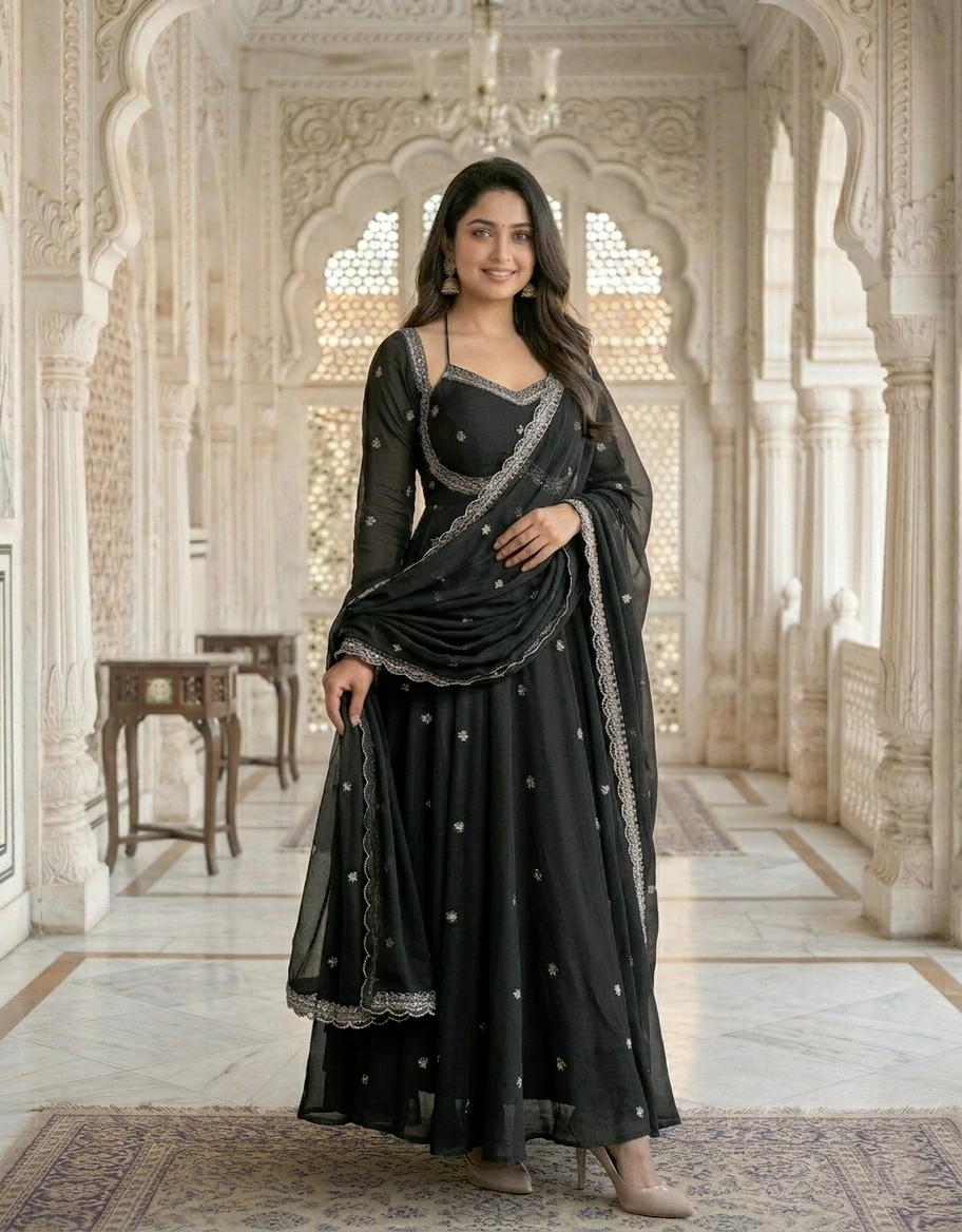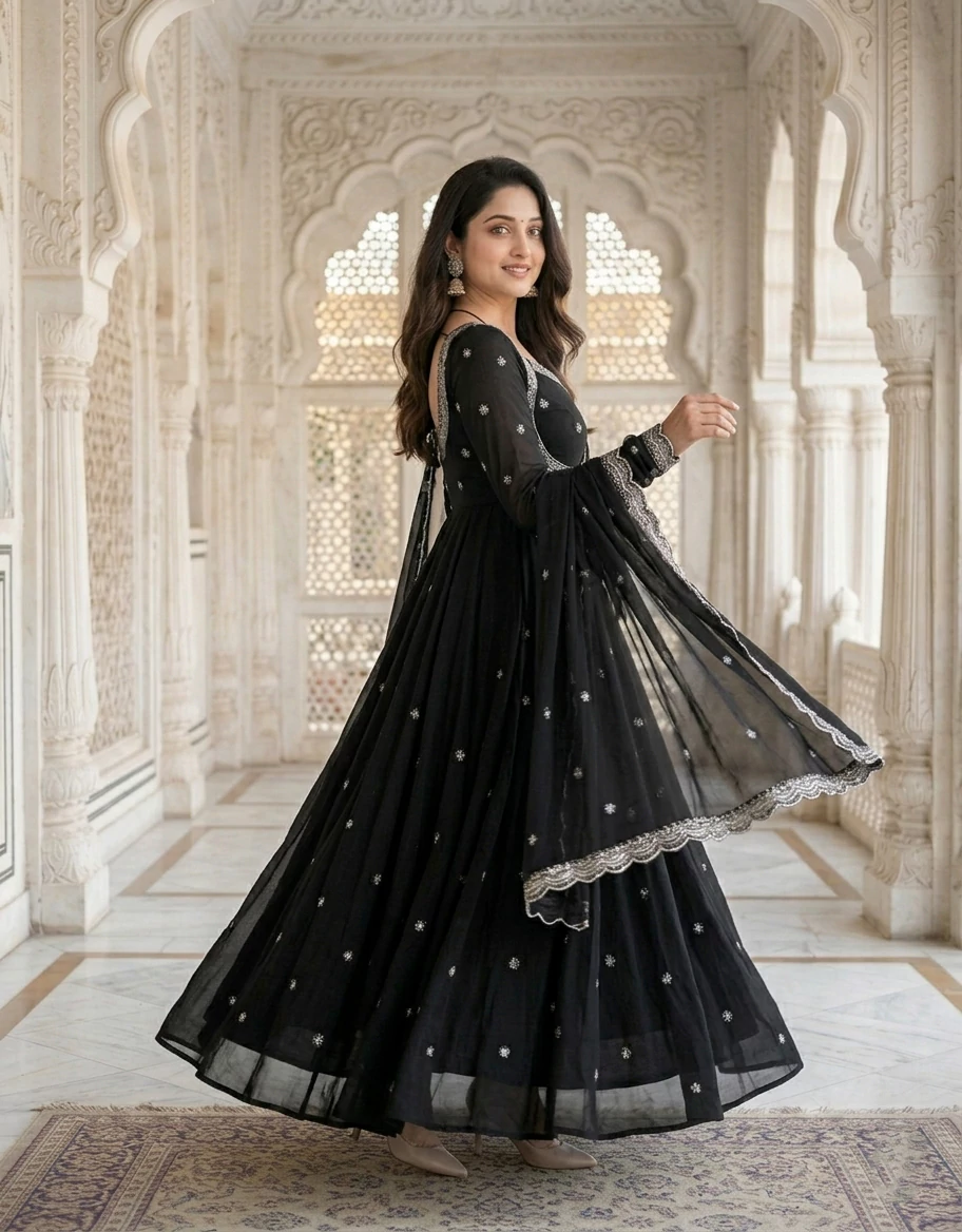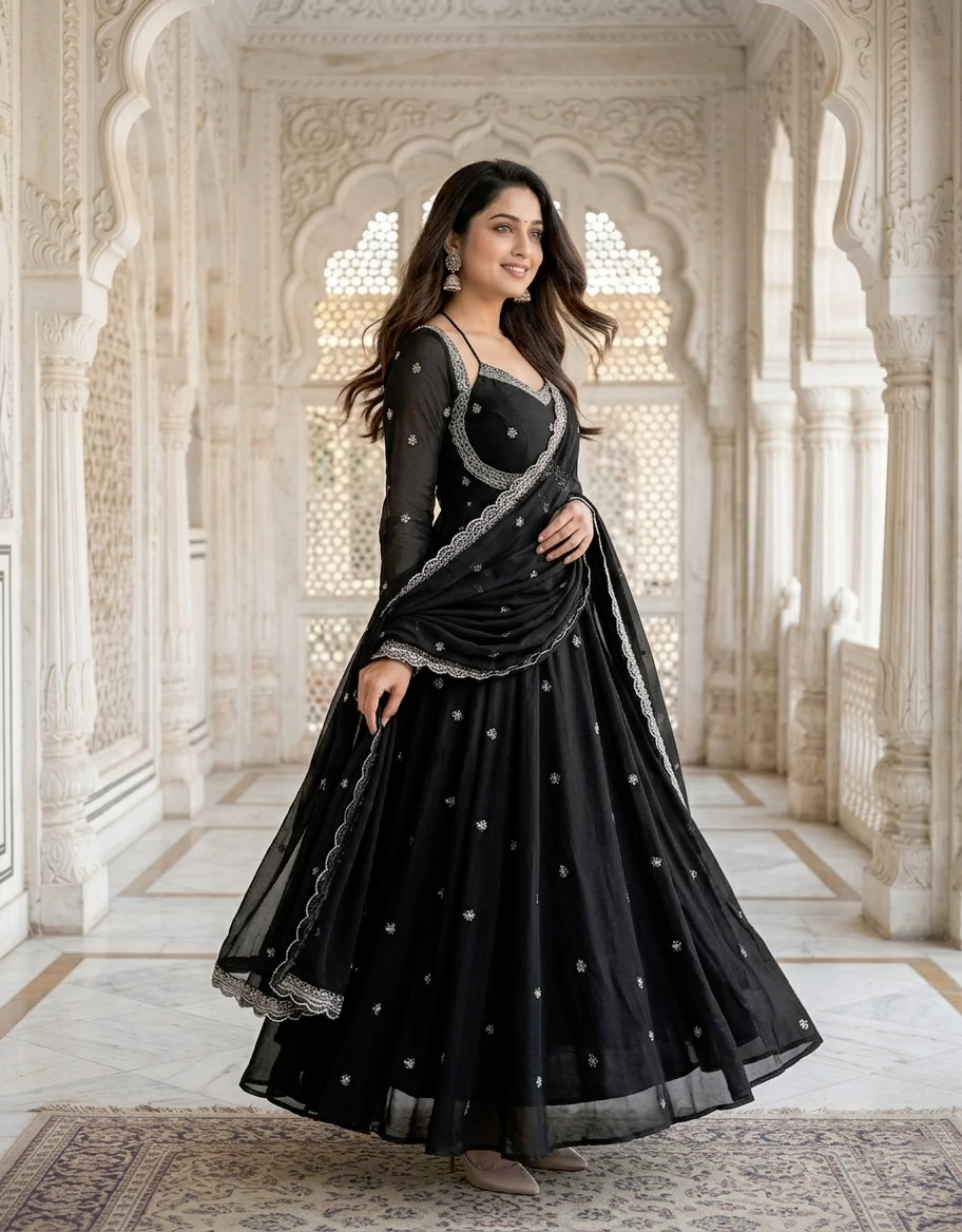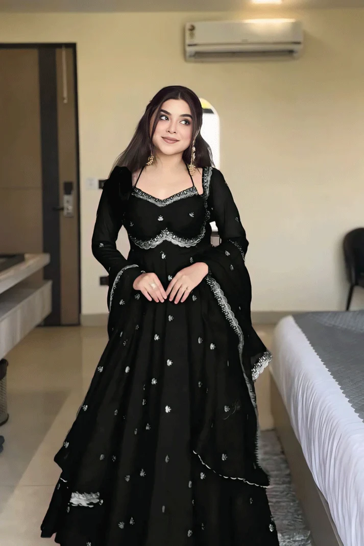 Exude timeless elegance with this classic black Anarkali gown, crafted from soft and flowy georgette fabric for a graceful silhouette. Adorned with delicate all-over embroidery, the gown features a beautifully embellished sweetheart-style neckline and yoke that add a refined festive touch.