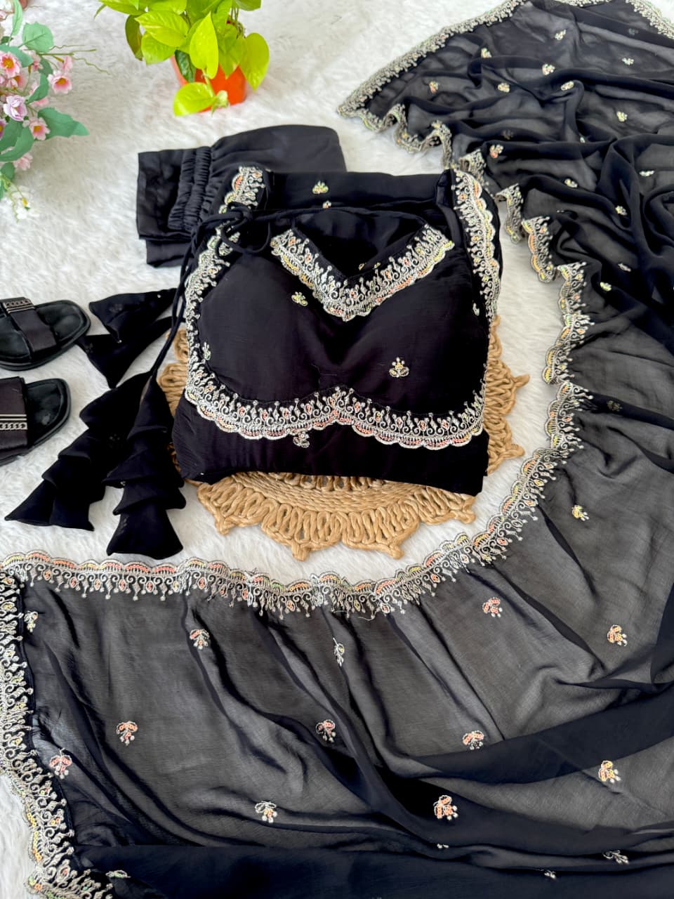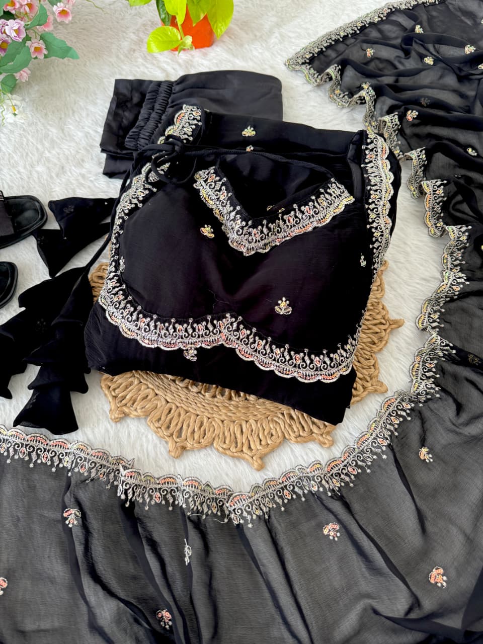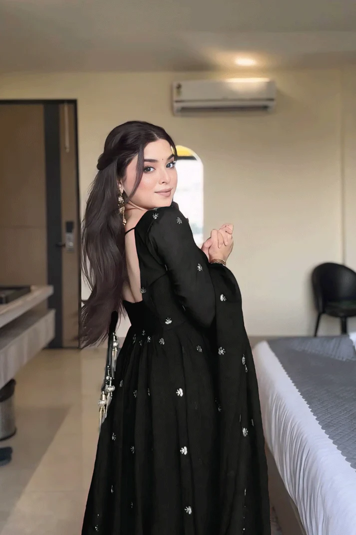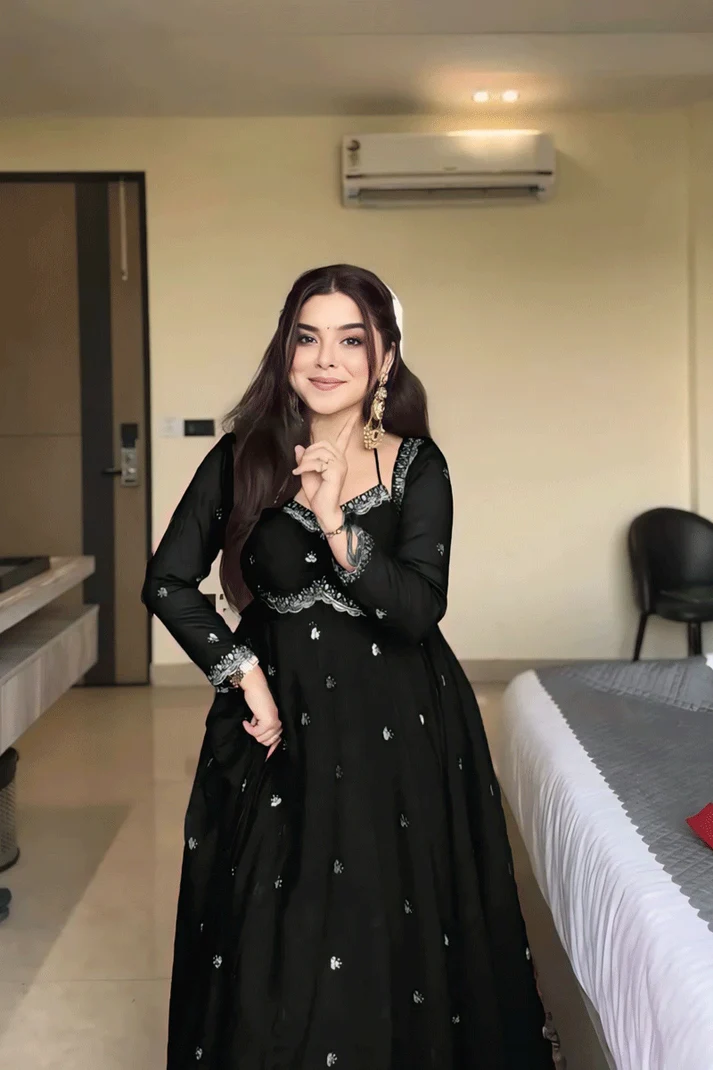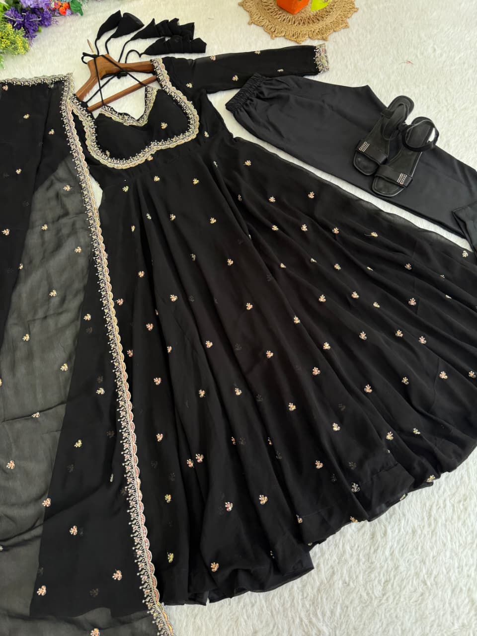 Exude timeless elegance with this classic black Anarkali gown, crafted from soft and flowy georgette fabric for a graceful silhouette. Adorned with delicate all-over embroidery, the gown features a beautifully embellished sweetheart-style neckline and yoke that add a refined festive touch.