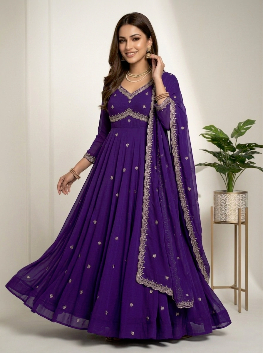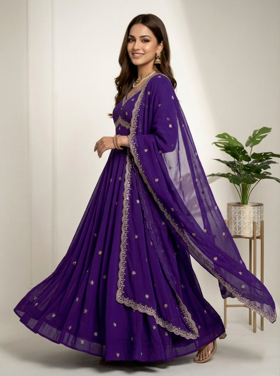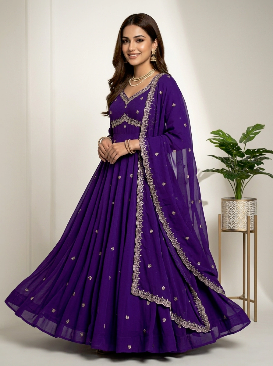 Enhance your ethnic style with this graceful lavender purple Anarkali gown, designed to offer a perfect balance of elegance and charm. The gown features a beautifully embroidered sweetheart neckline with fine detailing and delicate all-over butti embroidery that adds a subtle shimmer. Its flowy, flared silhouette and sheer full sleeves with embroidered borders create a regal and flattering look. Ideal for weddings, festive celebrations, parties, and special occasions, this Anarkali gown ensures timeless appeal and effortless comfort.
