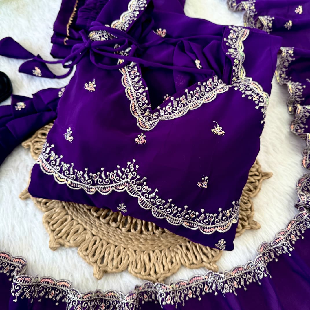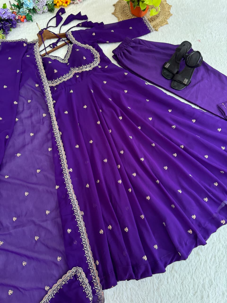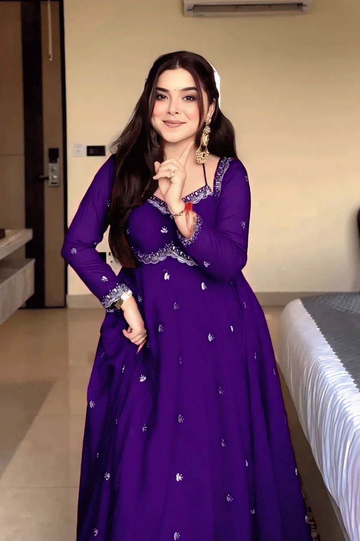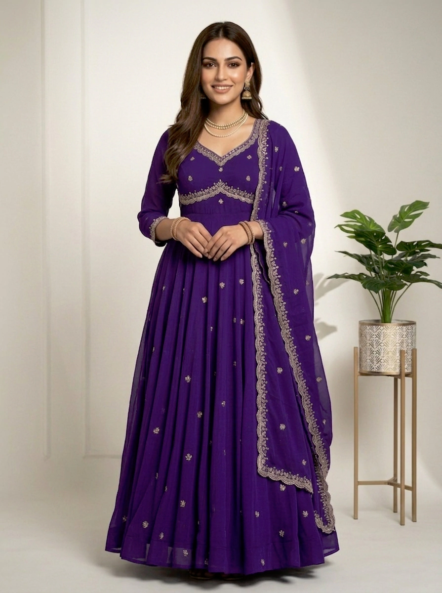 Enhance your ethnic style with this graceful lavender purple Anarkali gown, designed to offer a perfect balance of elegance and charm. The gown features a beautifully embroidered sweetheart neckline with fine detailing and delicate all-over butti embroidery that adds a subtle shimmer. Its flowy, flared silhouette and sheer full sleeves with embroidered borders create a regal and flattering look. Ideal for weddings, festive celebrations, parties, and special occasions, this Anarkali gown ensures timeless appeal and effortless comfort.