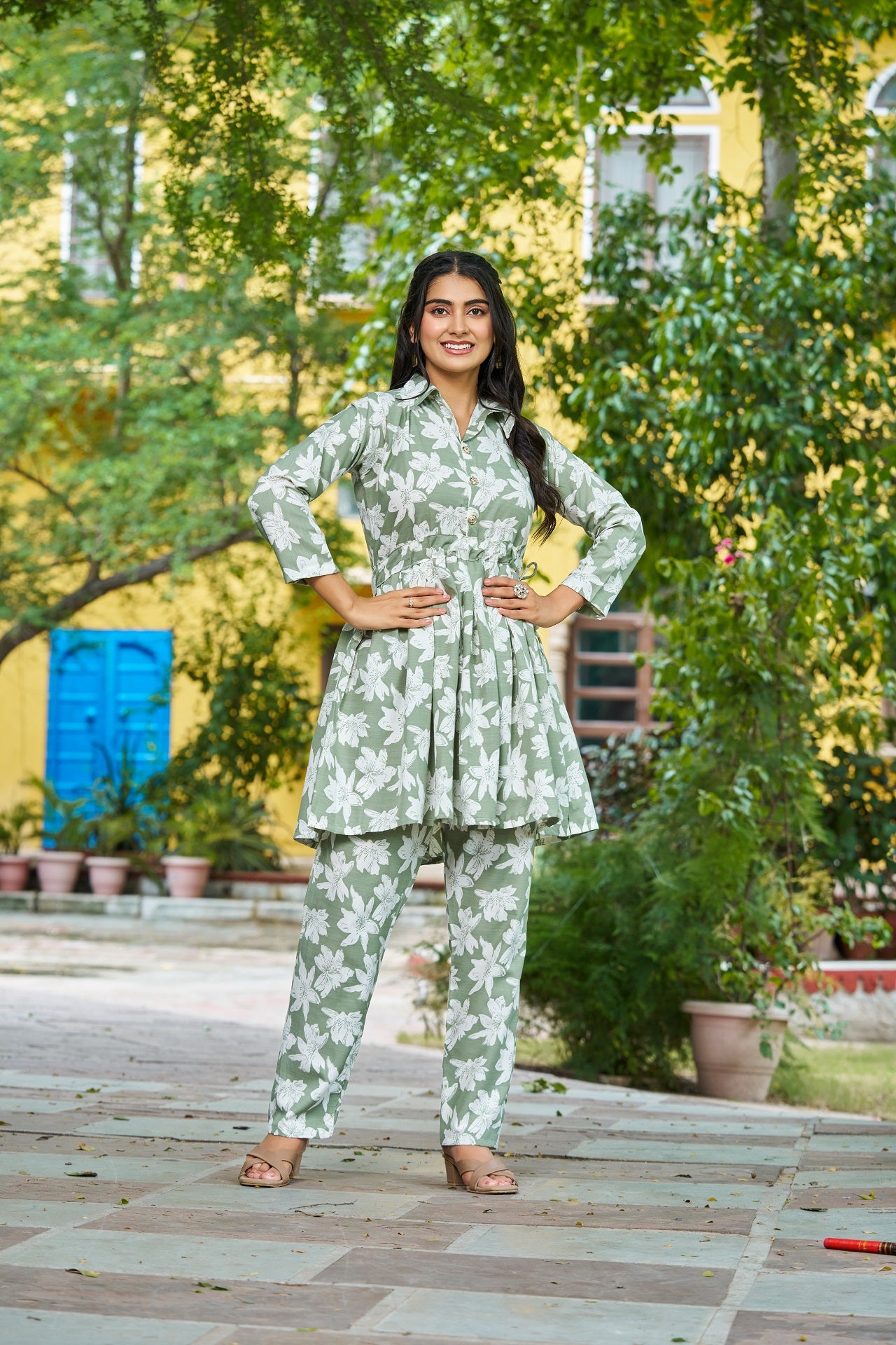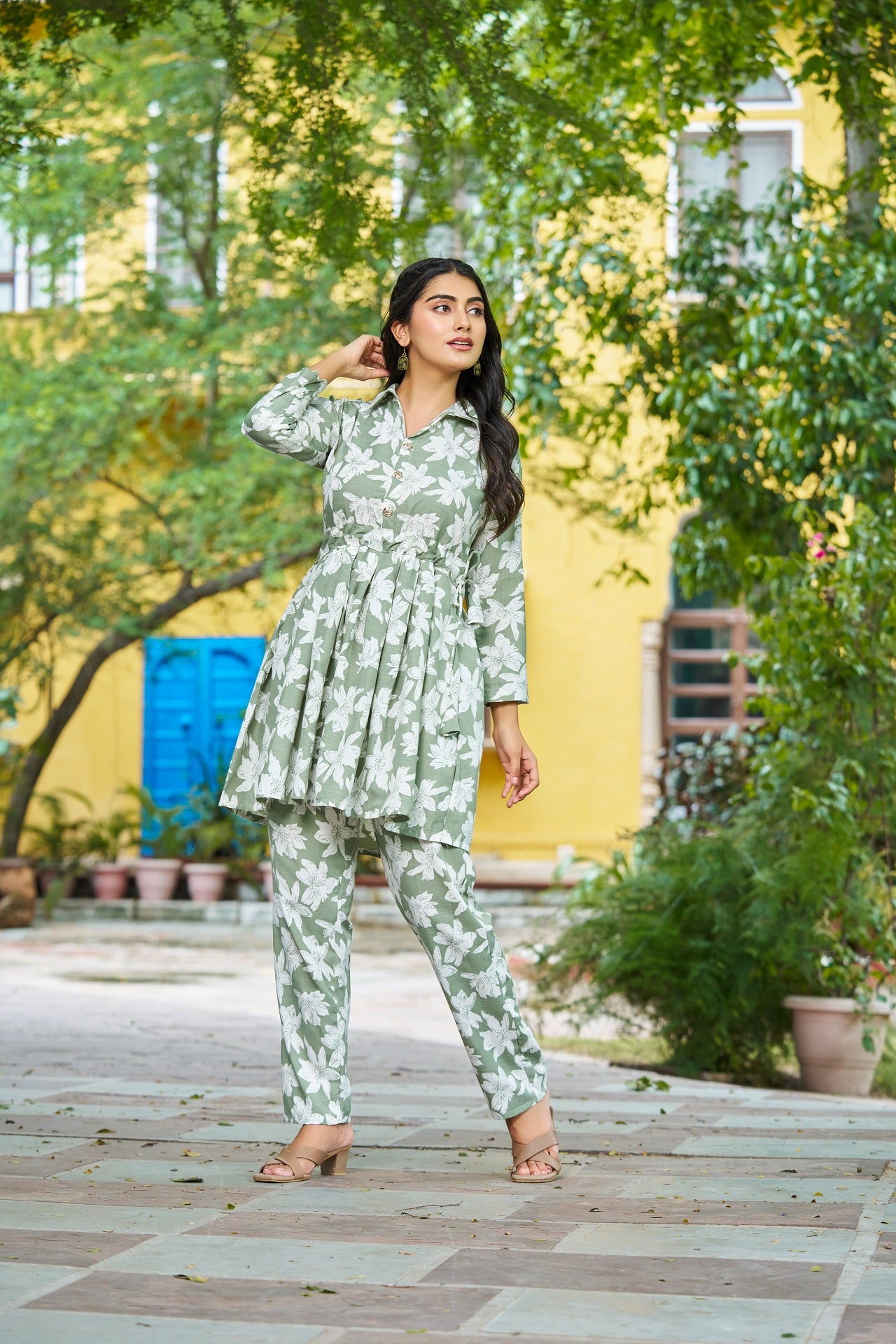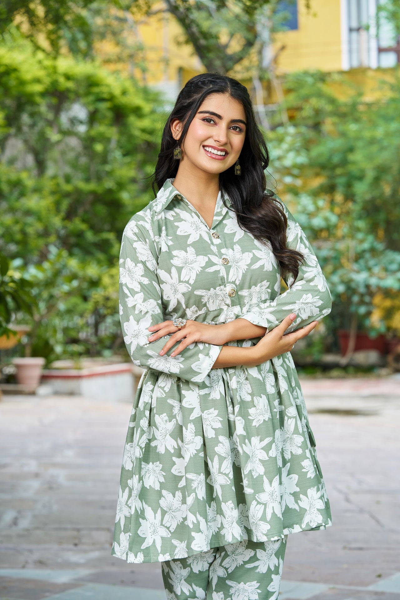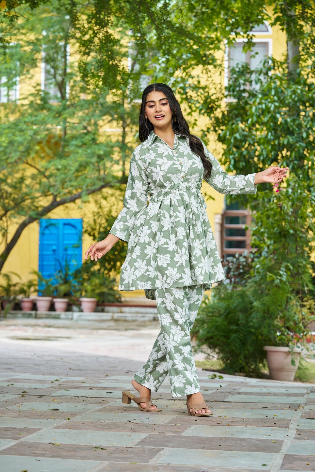 Turn heads with this effortlessly stylish pastel floral co-ord set, designed for modern women who value comfort and elegance. Crafted from soft, breathable fabric, this two-piece set features a button-down longline shirt with a notched collar and matching straight-fit pants. The dreamy floral print in soft pink, lavender, and blue tones adds a touch of feminine grace, making it perfect for casual outings, brunches, or relaxed evenings.