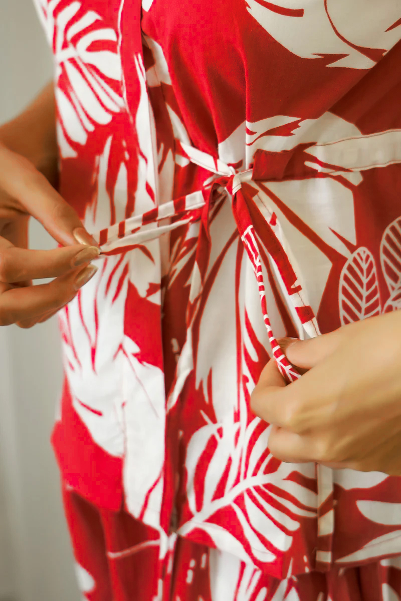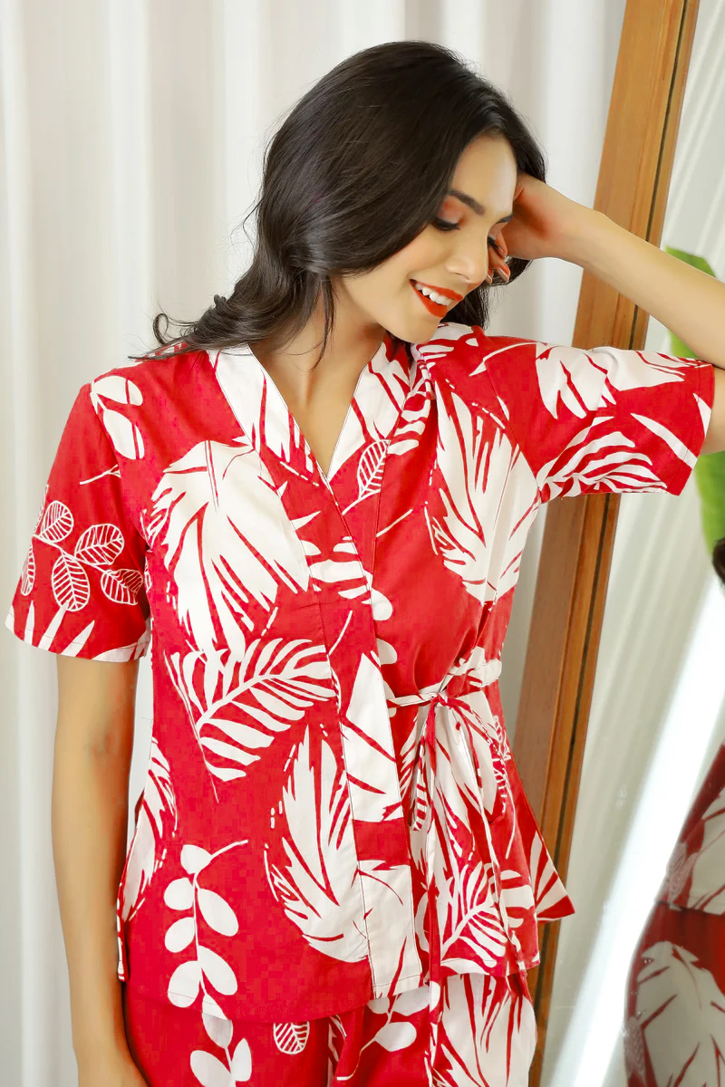 Relax in comfort and style with this vibrant red cotton nightwear set, designed with a trendy tropical leaf print. The set includes a short-sleeve button-down shirt and matching shorts, giving a relaxed yet fashionable look. Made from soft and breathable cotton fabric, it ensures maximum comfort, whether you’re lounging at home or getting a restful night’s sleep.