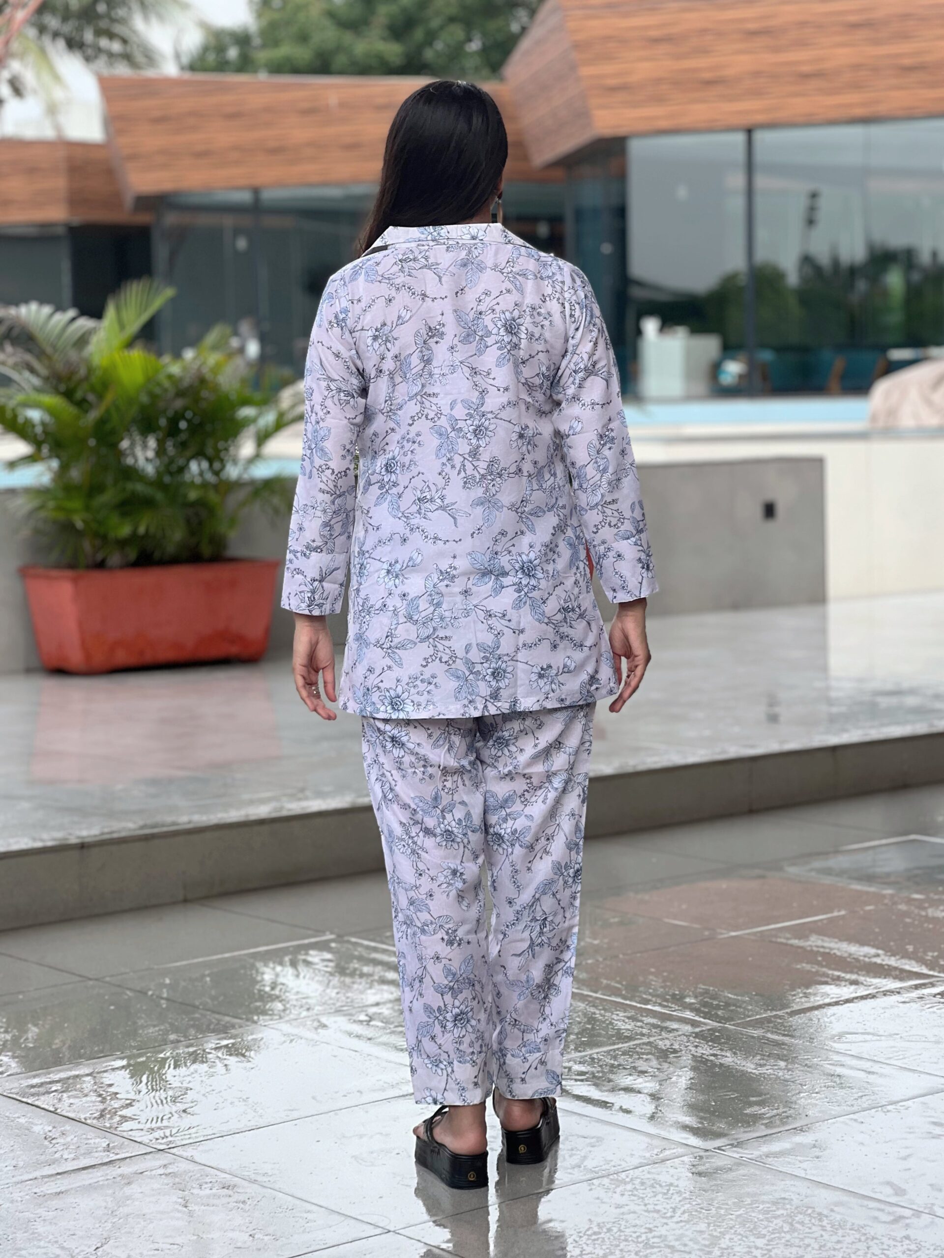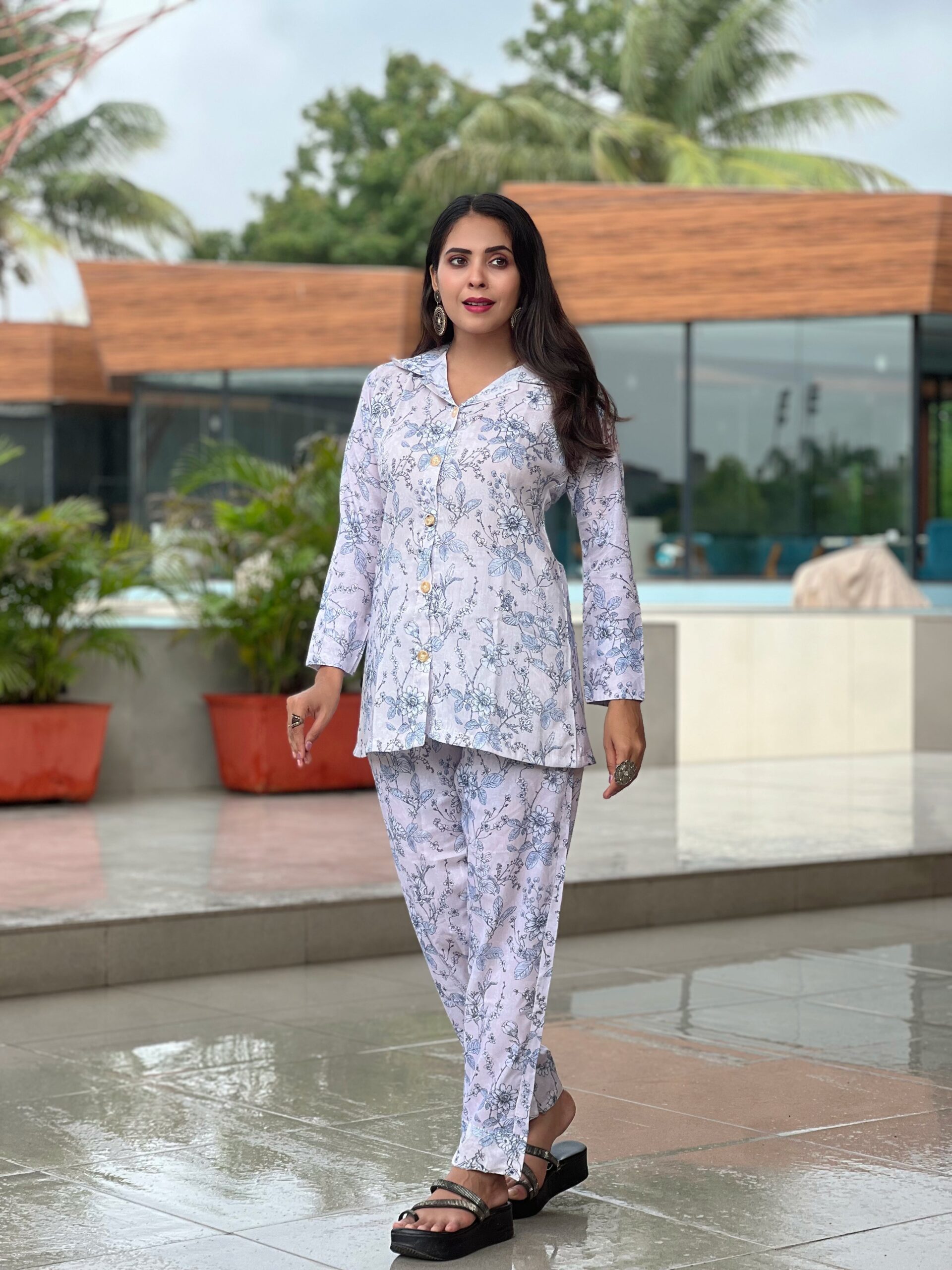 Turn heads with this effortlessly stylish pastel floral co-ord set, designed for modern women who value comfort and elegance. Crafted from soft, breathable fabric, this two-piece set features a button-down longline shirt with a notched collar and matching straight-fit pants. The dreamy floral print in soft pink, lavender, and blue tones adds a touch of feminine grace, making it perfect for casual outings, brunches, or relaxed evenings.