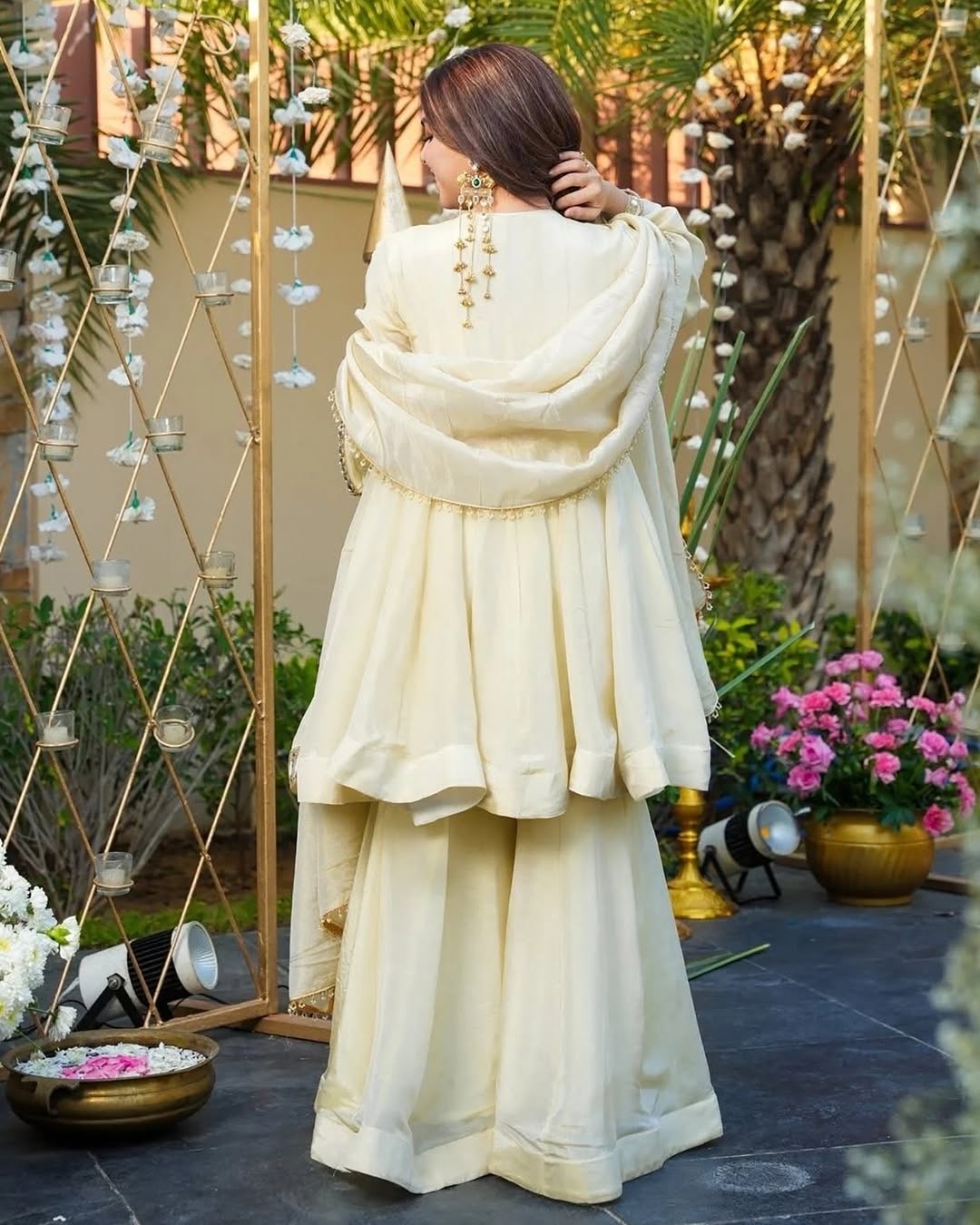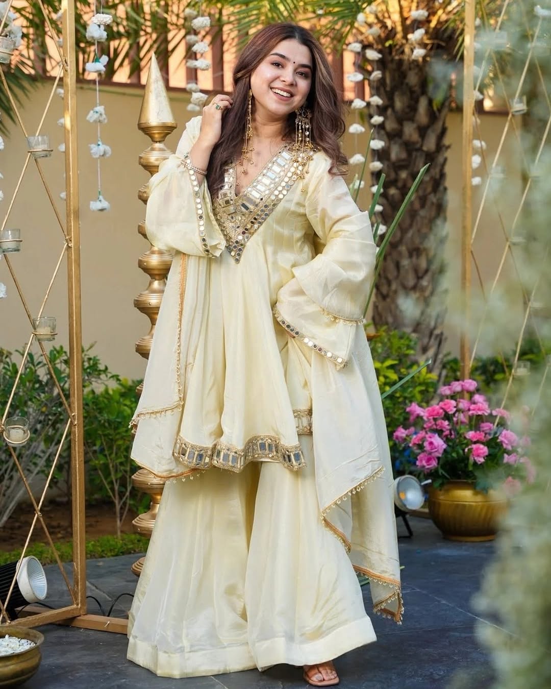 A radiant moment captured in soft ivory and gold. The flowing silhouette, mirror-work details, and delicate jewelry come together to create an effortless festive elegance. Set against a lush, floral backdrop, the look feels timeless, serene, and celebratory—perfect for a daytime celebration where tradition meets quiet glamour.